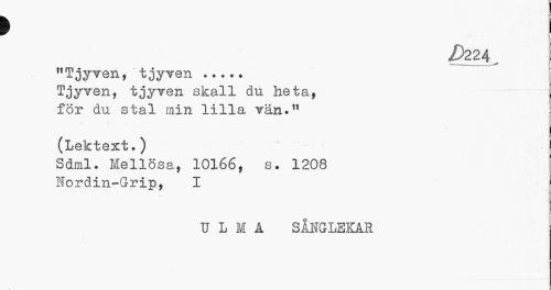 //// > //// /)224 „ //// "Tjyven, tjyven ... Tjyven, tjyven skall du heta, för du stal min lilla vän." //// (Lektext.) //// Sdml. Mellösa, 10166, s. 1208 Nordin-Grip, I //// UIIA SÅNGLEKAR ////