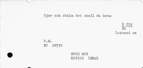 //// Tjuv och skälm det skall du heta- //// D 224 //// mt —m— //// Dr //// Leksand sn //// n.m. //// EU 28730 //// HORD MS //// W KOPIOR LEKAR ////