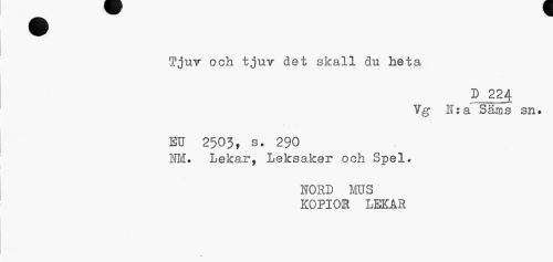 //// Tjur och tjuv det skall du heta //// D J224 Ig K:a Säms sn. //// EU 2503, s. 290 //// KM. Lekar, Leksaker och Spel. //// NORD MUS KOPIOR LEKAR ////