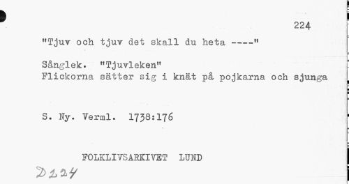 //// ^ 224 ' //// "Tjuv och tjuv det skall du heta---11 //// Sånglek. "Tjuvleken" //// Flickorna sätter sig i knät på pojkarna och sjunga //// i //// S. ITy. Verml. 1738:176 //// = //// FOLKLIVS ARKIVET LUND //// I ////
