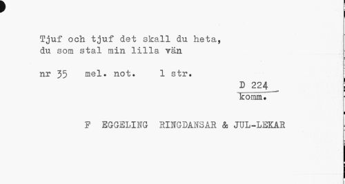 //// ! //// Tjuf och tjuf det skall du heta, du som stal min lilla vän //// nr 35 mel. not. 1 str. //// D 224 _ ! //// komm. r //// i //// P EGGELING RINGDANSAR & JUL-LEKAR ////