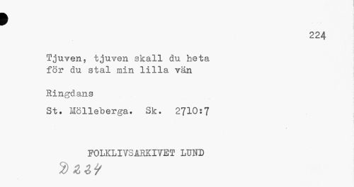 //// t //// 224 //// Tjuven, tjuven skall du heta för du stal min lilla vän //// Ringdans //// St. Mölleberga. Sk. 2710:7 //// F0LKLIYSARKIYET LUND //// 2) ////