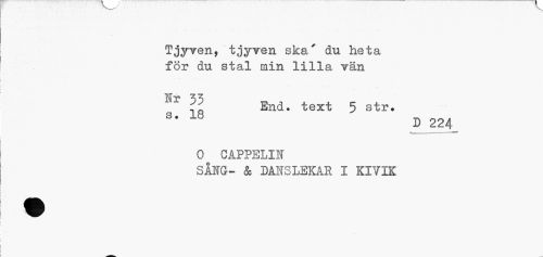 //// Tjyven, tjyven ska' du heta för du stal min lilla vän //// Nr 55 //// ^ End. text 5 str. //// s. 18 ^ //// D 224 //// O CAPPELIN //// SANG- & DANSLEKAR I KIVIK ////