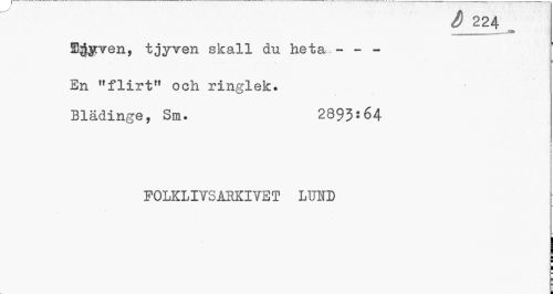 //// 0 224 //// B^jjtven, tjyven skall du heta - - - //// i _ //// En "flirt" och ringlek. Blädinge, Sm. 2893:64 //// FOLKLIYSAHKIVET LUND //// i ////