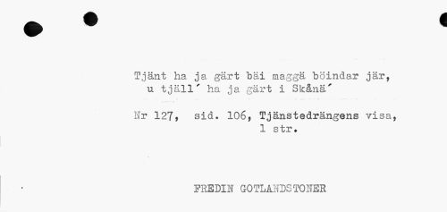 //// Tjänt ha ja gärt bäi maggä böindar jär, u tjäll' ha ja gärt i Skåna' //// Hr 127, sid. 106, Tjänstedrängens visa, //// 1 str. //// FREDIN GOTLANDSTONER ////