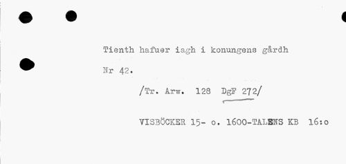 //// Tienth hafuer iagh i konungens gårdh ^^ Ifr 42. //// /Tr. Arw? 128 DgF 272/ //// VISBÖCKER 15- o. 1600-TALMS KB l6:o ////