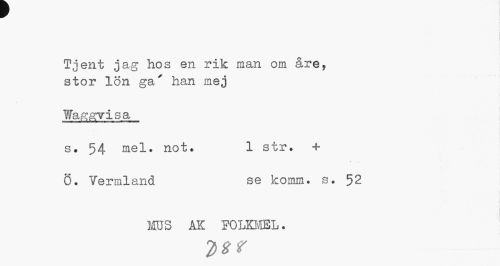 //// Tjent jag hos en rik man om åre, stor lon ga' han mej //// Wa^ffvisa //// s. 54 mel. not. 1 str. + //// Ö. Ver ml and se komrii. s. 52 //// MUS AK POLKIEL. ////
