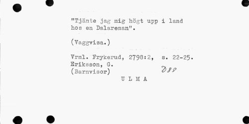 //// "Tjänte jag mig högt upp i land hos en Dalareman". //// (Vaggvisa.) //// Vrml. Frykerud, 2798:2, s. 22-25. Eriksson, G. //// (Barnvis or) & * //// U L M A ////
