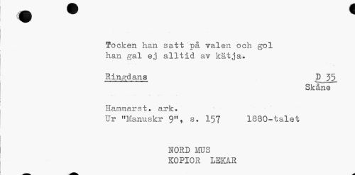 //// # //// Töcken han satt på valen och gol han gal ej alltid av kätja. //// Ringdans D 55 //// Skåne //// Hammarst. ark. //// Ur "Manuskr 9", s. 157 1880-talet //// nord ms //// kopior lekar ////