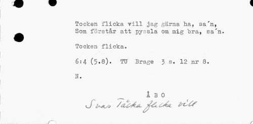 //// Töcken flicka vill jag gärna ha, sa'n, ^^ Som förstår att pyssla om mig bra, sa'n. //// Töcken flicka. //// 6;4 (5•8)• TU Brage 3 s. 12 nr 8. //// H. //// o _ //// A B 0 //// r~"\ / ////