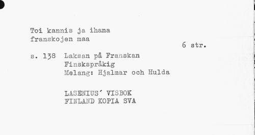 //// r //// Toi kannis ja ihana //// franskojen maa ; //// 6 str# //// s. 138 Laksan på Franskan //// Finskspråkig //// Melang: Hjalmar och Hulda //// LASENIUS' TISBOK FINLAND KOPIA SYA ////