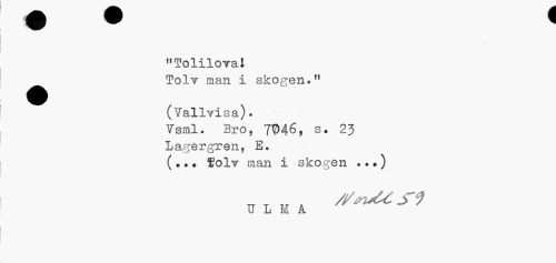 //// "Toliloval ^^ Tolv man i skogen." //// (Vallvisa). //// Tsml. Bro, 7$4ö, s. 23 Lagergren, E. //// (•. • folv man i skogen ..•) //// U L M A ////