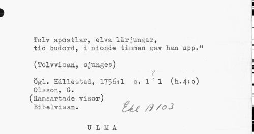 //// ) i //// Tolv apostlar, elva lärjungar, r //// tio budord, i nionde timmen gar han upp." " //// (Tolwisan, sjunges) | //// t : //// Ögl. Hällestad, 1756*1 s. 1 ' 1 (h.4*o) B Olsson, G. (Ramsartade visor) //// Bibelvisan. fyj /)/o3 j //// U L M A I ////