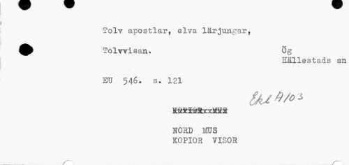 //// ToIt apostlar, elva lärjungar, //// Tolwisan. Ög //// Hällestads sn //// EU 546. s. 121 //// S&Ei&äxx3B8 //// NORD MUS KOPIOR VISOR //// r ////