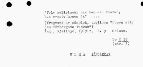 //// "Tolv gullringar gav han sin fästmö, hon svarte honom ja" ... //// (fragment av sånglek, troligen "öppen står //// den förborgade luckan") //// Ang., Fjällsjö, 1919:7> s. 9 Ohlson. //// Se D 29 //// (stTTJ) //// U L //// M A SÅNGLEKAR ////