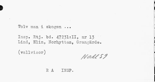 //// i i //// Tolv man i skogen *.. !. //// Insp. Htj.bd. 47231:11, nr 13 i //// Lind, Elin, Horhyttan, Grangärde. 1 //// (vallvisor) ¦ //// = //// R A INSP. j ////