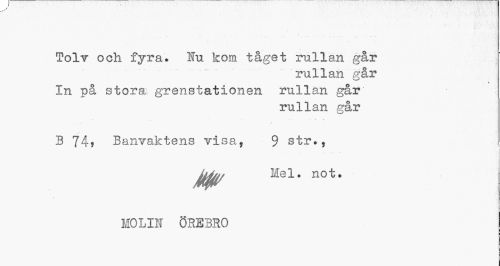 //// Tolv och fyra. Ku kom tåget rullan går //// rullan går //// * //// In på stora grenstationen rullan går //// rullan går //// . ... .. » * //// B 74, Banvaktens visa, 9 str., //// Jfåp/ Mel. not. //// MOLIN ÖREBRO //// t ////