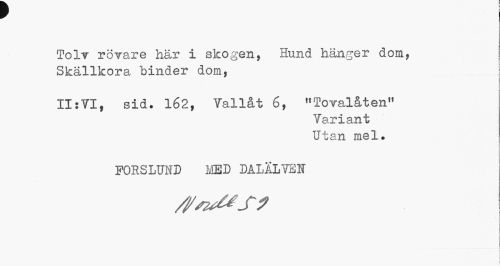 //// Tolv rövare här i skogen, Hund hänger dom, Skällkora binder dom, //// II:VI, sid. 162, Vallåt 6, »Tovalåten" //// Variant Utan mel. //// 1 //// FORSLUND MED DALAL7SN //// ¦ I //// I //// I ////