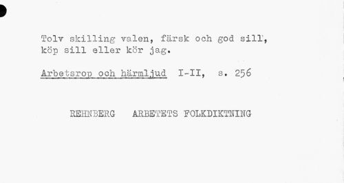 //// f //// \ //// Tolv skilling valen, färsk och god sill, köp sill eller kör jag. //// Arbetsrop och härml.jud I-II, s. 256 HEMBERG ARBETETS FOLKDIKTNING ////