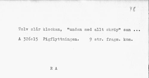 //// u //// Tolv slår klockan, "undan med allt skräp" san ... //// . . .'t * //// A 326:15 Pigflyttningen. 9 str. fragm. kom. //// J //// H A ////
