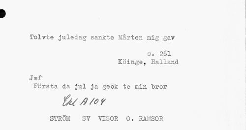 //// > //// j //// Tolvte juledag sankte Mårten mig gav //// s. 261 Köinge, Halland //// i //// i //// Jmf //// Första da jul ja geck te min bror STRÖM SV VISOR 0. RAMSOR ////