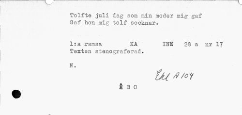 //// Tolfte juli dag som min moder mig gaf Gaf hon mig tolf socknar. //// 1:a ramsa KA IHE 28 a nr 17 //// Texten stenograferad. //// N. //// {M^/oi //// t BO ////