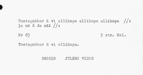 //// Tomtegubbar ä vi allihopa allihopa allihopa //: ja mä å du mäl //: //// ... .. •• v - //// Nr 65 3 str. Mel. //// Tomtegubbar ä vi allihopa. //// BRODIN JULENS VISOR ////
