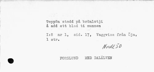 //// . ___ ... i : ... _.•• • . //// Toppön stödd på brönlotji å add ett blad ti munnen //// - - - j .. - . ? - • . //// It 6 nr 1, sid. 17* Vaggvisa från Oja, 1 str. //// ftfUtltO //// ^ FOHSLUND MED DALÄLVEN ////