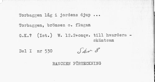 //// To rb aggen. låg i jordens djup ... //// \ //// Torbaggen, bromsen o. flugan //// G.K.? (Ist.) W. 12.2+omqv. till hvardera - //// skämtsam //// Del I nr 530 ^ //// RANCKEN FÖRTECKNING ////