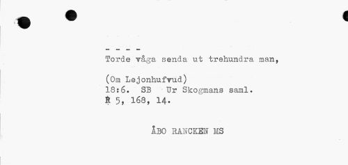 //// » 1 *¦ //// Torde Taga senda ut trehundra man, //// (Om Lejonhufrud) //// 18:6. SB ' Ur Slcogmans saml. //// Ä 5, 168, 14. //// ABO RANCKEH MS //// k ////