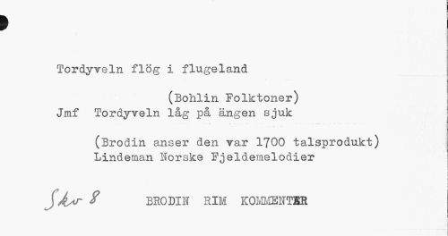 //// > //// Tordyveln flög i flugeland //// (Bohlin Folktoner) Jmf Tordyveln låg på ängen sjuk j //// (Brodin anser den var 1700 talsprodukt) Lindeman Norske Fjeldemelodier //// 1 ! //// i //// V //// 1 //// 1 //// BRODIN RIM KOMMENTSR ////