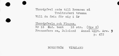 //// Thordyfvel sade till Bromsen så //// Trultraderi trumma Vill du fria för mig i år //// ^^ Thor dy f vein och Flugan» //// Ir 16 End. text" 18 str. (Skv 8) Frennefors sn, Dalsland Annan uppt. Arv?. $ //// p. 472 //// BORGS TRÖM VARMLAND ////