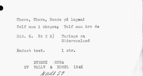 //// > //// Thore, Thore, Bonde på logen! Tolf man i skogen; Tolf man aro de //// Sid. 6. Hr 2 h) Turinge sn //// Södermanland //// ja //// Endast text. 1 str. //// DYBECK ¦ RUNA SV VALL V & HO ML 18 46 ////