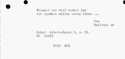 //// Trampat ner mitt vackra lin //// och sparkat mullen undan löken ..? //// Vsm //// Skultuna sn //// Mskpt Årbetssånger I, s. 91» eu 19283 //// hord mus ////
