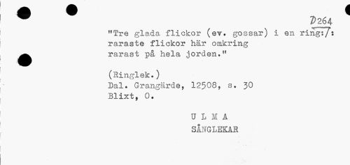 //// ® T> 264 //// "Tre glada flickor (ev. gossar) i en ringT/s raraste flickor här omkring rarast på hela jorden." //// (Ringlek.) //// Bal. Grangärde, 12508, s. 30 Blixt, 0. //// USA SÅNGLEKAR //// < % ////
