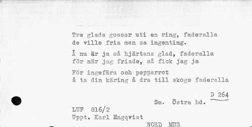 //// .V ¦.'.'/ ' ' " \ -t • • //// Tre glada gossar uti en ring, faderalla de ville fria men sa ingenting. //// o //// A nu är ja så hjärtans glad, faderalla för när jag friade, sa fi c k j ag j a //// För ingefära och pepparrot å ta din käring å dra till skogs faderalla //// D 264 //// Sm. Östra hd. """ //// LUF * 816/2 //// Uppt. Karl Engqvist ////