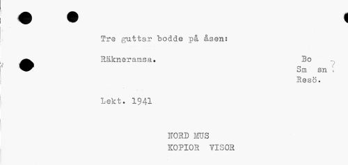 //// Tre guttar bodde på åsens //// •Räkneramsa. Bo //// l //// bm sn ^ Resö. //// Lekt. 1941 //// HORD MUS KOPIOR TIS OR ////