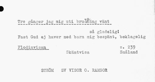 //// I i //// fre gånger jag mig uti brudiang vänt //// så gladeligt //// Fast Gud ej haver med barn mig bespänt, beklagelig //// • z //// Flodinvisan s. 239 //// Skämtvisa Småland //// STRÖM SV VISOR 0. RAMSOR ////