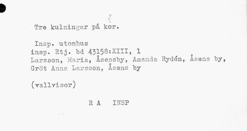 //// w //// ? //// i //// Tre kulningar på kor. //// Insp. utomhus insp. Rtj. bd 43158:XIII, 1 //// Larsson, Maria, Asensby, Amanda Rydén, Åsens by, Gröt Anna Larsson, Åsens by //// (vallvisor) //// R A INSP //// • % ////