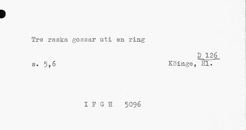 //// > //// I //// Tre raska gossar uti en ring //// IL 126, //// s. 5,6 Köinge, Hl. //// I F G H 5096 ////