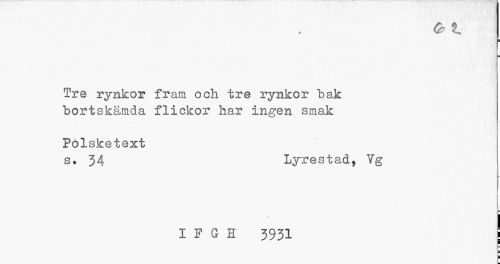 //// (b t //// Tre rynkor fram och tre rynkor bak bortskämda flickor har ingen smak //// Polsketext //// s. 34 Lyrestad, Vg //// I F G H 3931 S //// i //// i ¦ ////