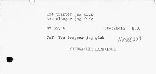 //// Tre trappor jag gick tre slängar jag fick //// Nr 359 A. Stockholm. E.S. //// Jmf Tre trappoor jag gick ftiDdU 3^ //// ITORDLAHDER BARHVTSOR ////