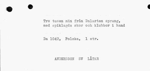 //// Tre tusen mäh från Dalarten sprang, med spiklagda skor och klubbor i hand //// ... i- #»¦»¦• //// Da 1042, Polska, 1 str. //// ANDERSSON SV LÅTAR ////