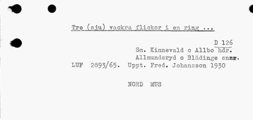 //// Tre (sju) vackra flickor i en ring ... //// ^^ Sm. Kinnevald o Ållbo hdrl //// Ållmundsryd o Blädinge sn»». LUF 2893/65. Uppt. Fred. Johansson I93O //// hord mus ////