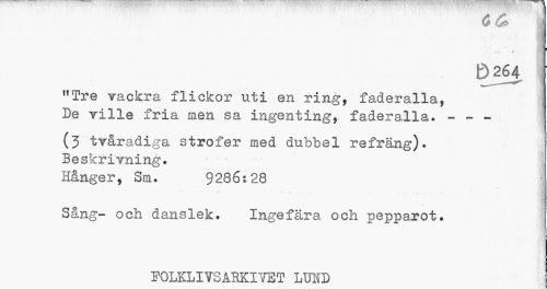 //// <5 6 i //// Ir^L //// D 264 //// ,!Tre vackra flickor uti en ring, faderalla, De ville fria men sa ingenting, faderalla. - - - //// (j tvåradiga strofer med dubbel refräng). Beskrivning. //// Hånger, Sm. 9286:28 //// ¦ //// • * ... . .. ... //// Sång- och danslek. Ingefära och pepparot. //// FOLKLIVS ABKIYET LIffiD | ////