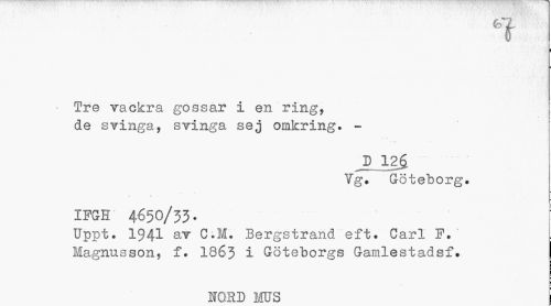 //// • Tre vackra gossar i en ring, de svinga, svinga sej omkring. - //// ¦¦i //// 7 g. ^Göteborg. //// å ¦ //// IFGET 4650/33. //// Uppt. 1941 aT C.M. Bergstrand eft. Carl F. Magnusson, f. 1863 i Göteborgs Gamlestadsf. //// mi?t» mtts i ////