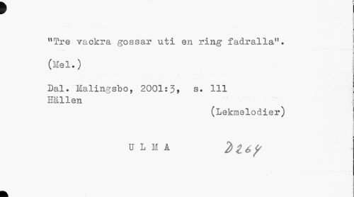 //// w //// "Tre vackra gossar uti en ring fadralla". (Mel.) //// Dal. Malingsbo, 2001:3, s. 111 Hällen //// (Lekmelodier) //// U L M A 2) Zé>y ////