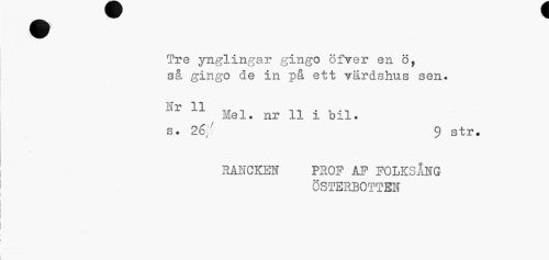 //// Tre ynglingar gingo öfver en ö, så gingo de in på ett värdshus sen. //// Ifr 11 //// Mel. nr 11 i bil. s. 26;' 9 str. //// RANCKEN PROF AF FOLKSÅNG //// ÖSTERBOTTEN ////
