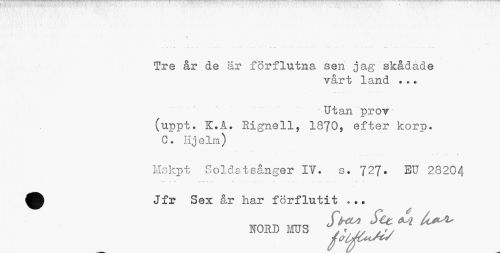 //// SJ //// Tre år de är förflutna sen jag skådade //// vårt land ..* //// Utan prov //// (uppt. K.A. Rignell, 1870, efter korp. //// C. Ejelm) //// 4 //// Mskpt Soldatsånger IV. s. 727. BU 28204 ^^ Jfr Sex år har förflutit ... //// S treta Stt Icj^ //// nord mus , t „ ] v ////