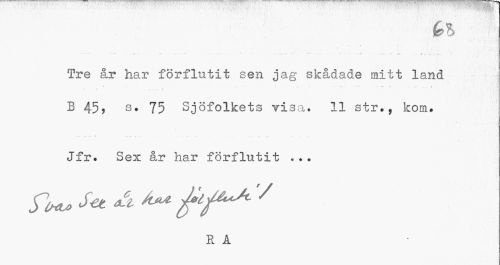 //// * • . //// ••• .. .. .- -.-• ... . . .. ' ¦ •• ¦ . . ¦ .1 . .. -i ... • . „. //// Tre år har förflutit sen jag skådade mitt land //// ...• . . - . //// / <- ... ¦> //// B 45? 75 Sjöfolkets visa. 11 str., kom. //// — » •• « ... ... .. .. //// Jfr. Sex år har förflutit .?. //// R Å ////